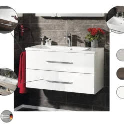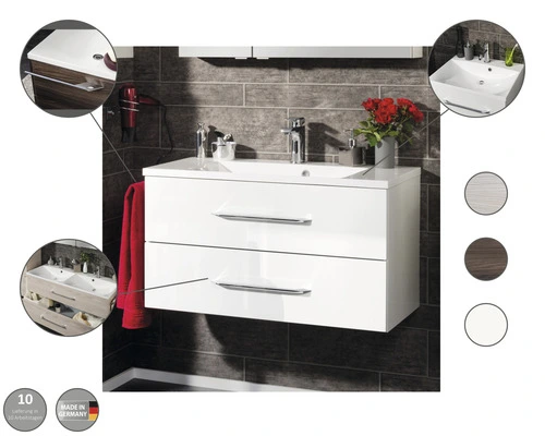 Hier bekommen Sie Waschtisch und Unterschrank in einem praktischen Set. Beide Teile sind perfekt aufeinander abgestimmt und wirken wie aus einem Guss. Der Waschtisch fügt sich fast nahtlos in den hochglänzenden Unterschrank mit den zwei Soft-Close-Schubladen ein.