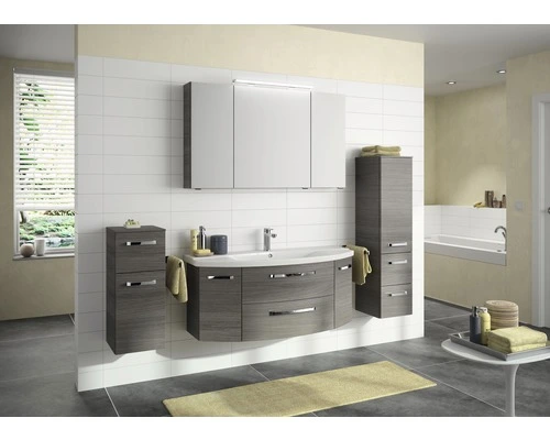 Übersichtliche Auswahl, praktische Handhabung, schnelle Lieferung – dafür steht die Xpressline 4010. Das Modell 4010 erweist sich dabei als besonders gefällig. Der leicht gewölbte Waschtischunterschrank verleiht, zusammen mit dem großzügigen Keramik-Waschtisch, dem Badezimmer eine sinnliche Anmutung. Individuelle Konstellationen ergeben sich in Kombination mit den passenden Wandschränken und Spiegelschränken, die unkompliziert aus der Übersicht gewählt werden können. Vier verschiedenen Farben, Graphit, Mokka, Weiß Glanz, Sanremo Eiche Terra mit teilweise sichtbarer Querstruktur, bieten eine umfassende Bandbreite, um das Passende zu finden. Die Möbel sind mit einer hochwertigen und Pflegeleichten Folie überzogen. Innen ist Ihr Badmöbel-Set mit weißem Melamin beschichtet: Ideal für eine schnelle Reinigung und weniger Feuchtigkeitsanfällig. Die glänzenden Bügelgriffe in Chrom komplettieren das Gesamtbild harmonisch. Dabei überzeugt die Linie mit funktionalem Nutzen und hoher Qualität – Xpressline auf 4010.